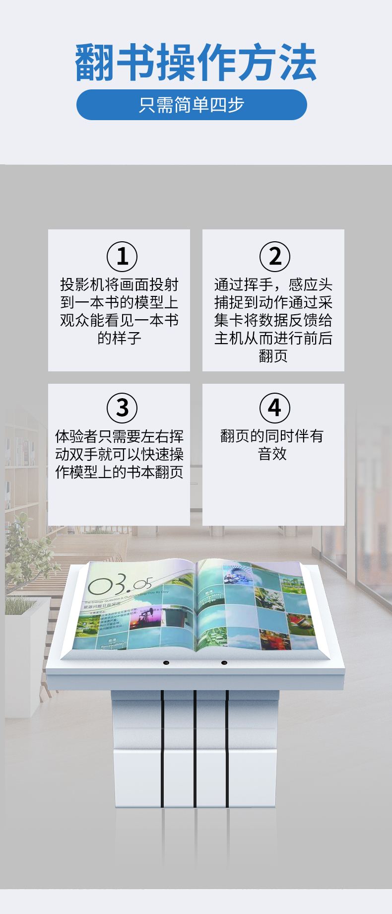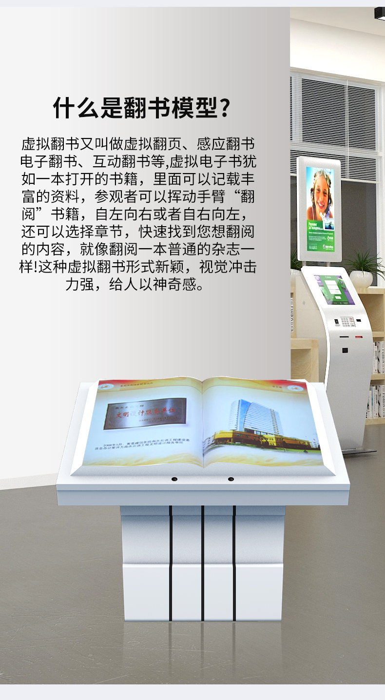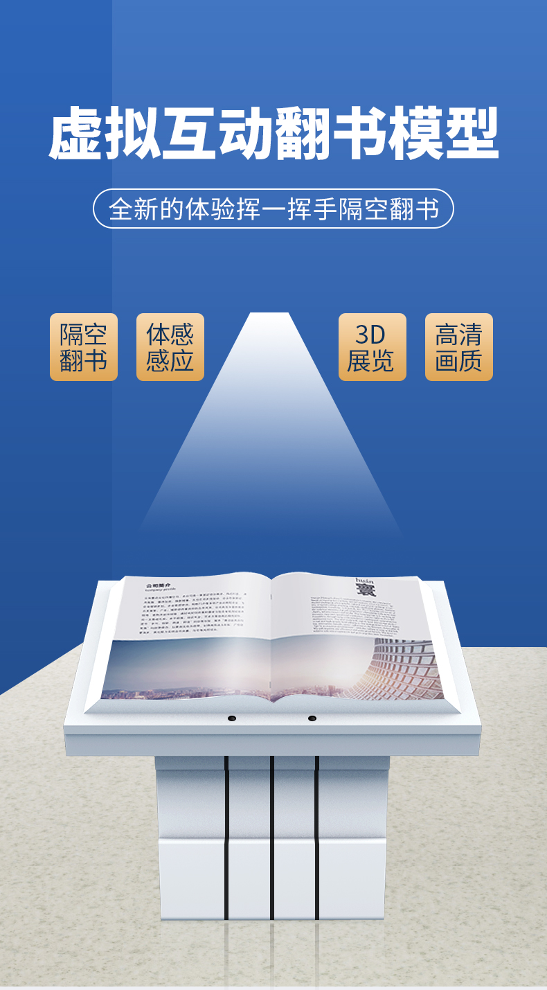 虛拟翻書又(yòu)稱電(diàn)子翻書、互動翻書、翻書軟件、隔空翻書、空中(zhōng)翻書、自動翻書、魔幻翻書、立體(tǐ)翻書、虛拟翻頁(yè)、虛拟電(diàn)子書等。 虛拟翻書猶如一本打開的書籍,裏面可(kě)以記載豐富的資料(包括動畫、視頻、圖片)。參觀者可(kě)以揮動手臂“翻閱”書籍,自左向右或者自右向左,還可(kě)以選擇章節,快速找到您想翻閱的内容,就像翻閱一本普通的雜志(zhì)一樣,這就是虛拟翻書系統帶來的驚喜!虛拟翻書形式新(xīn)穎,視覺沖擊力強,給人以神奇感,而且可(kě)以展示的信息量大。